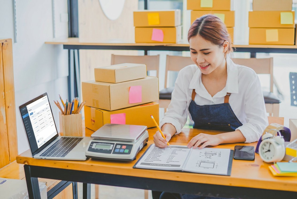 Small business owner weighing a package on a bench top parcel scale at an ecommerce packing station